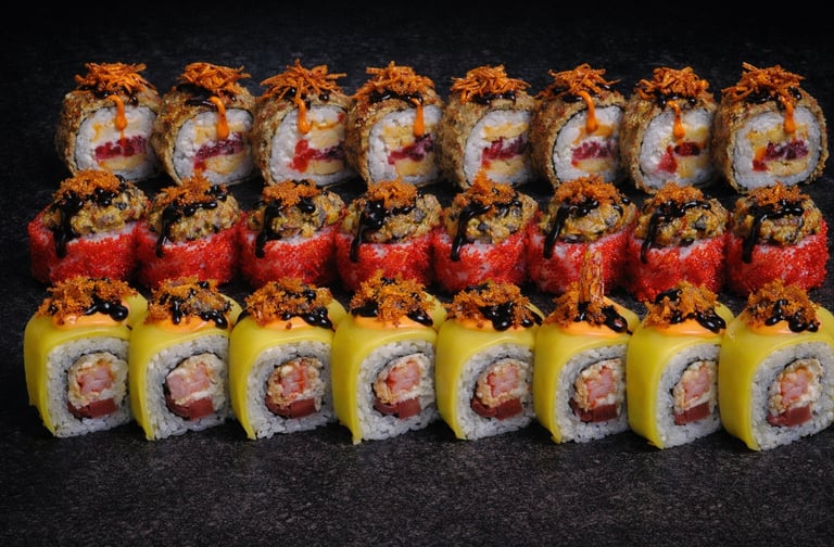 A22. abs warning (8 gb.) - tempura garneles, takuan, tomāti, krēmsiers, āsa mērce, unagi mērce, panko, dehidrētas olīvas.